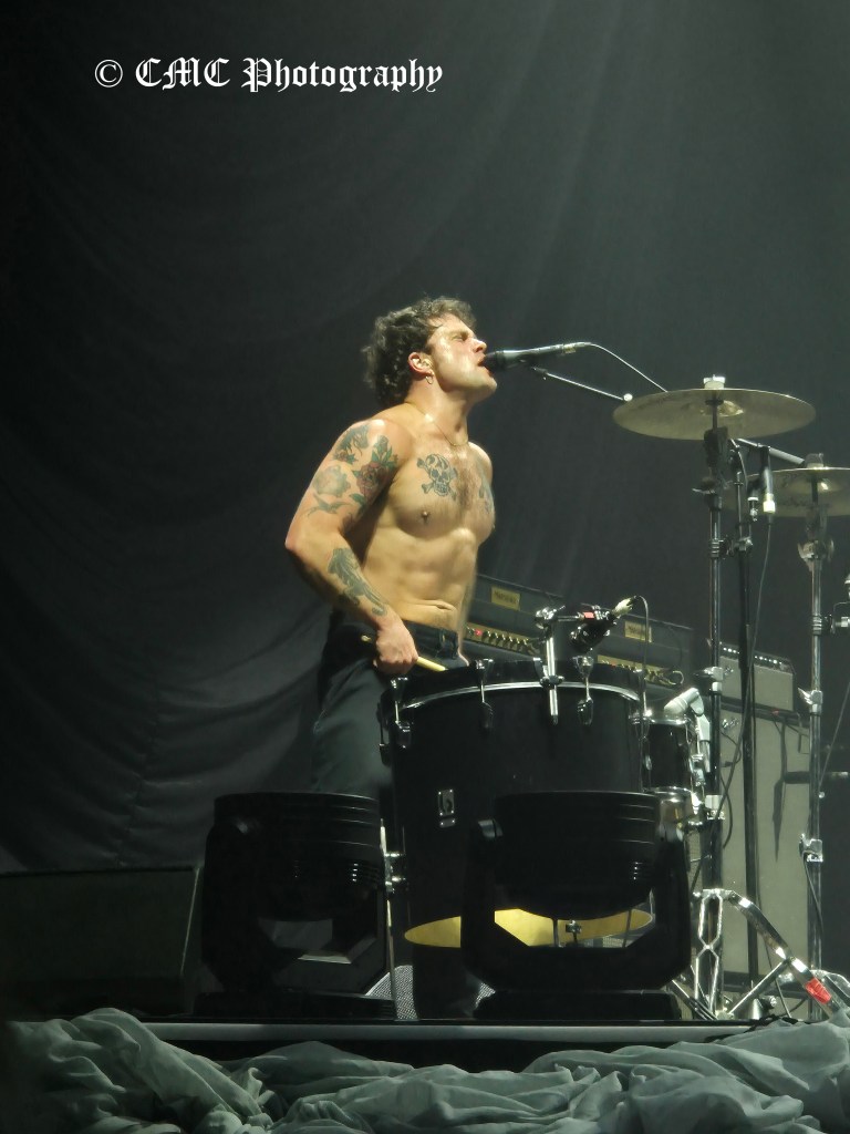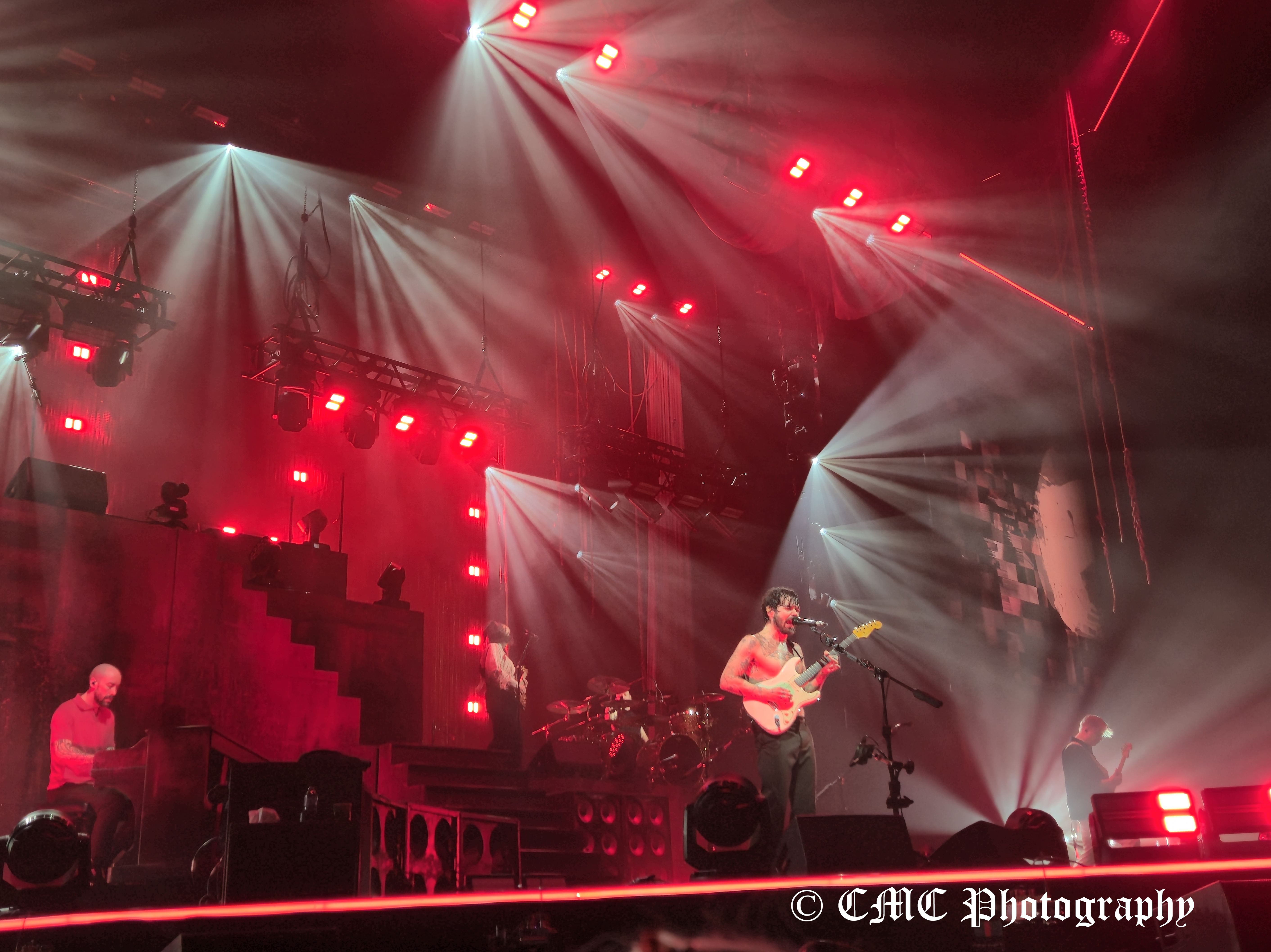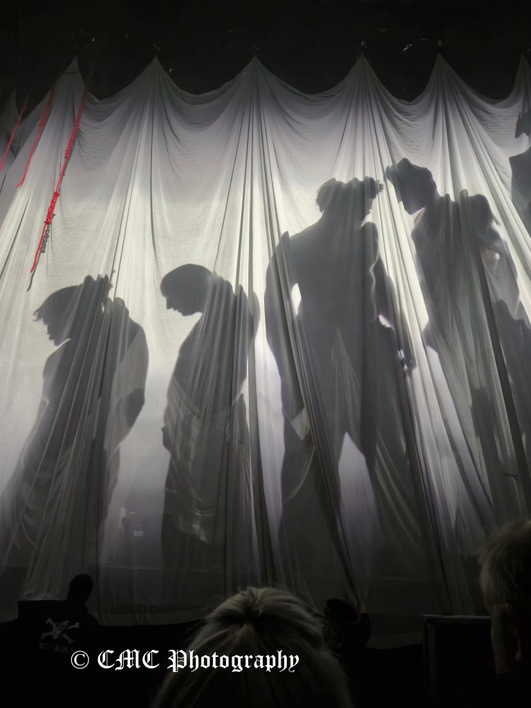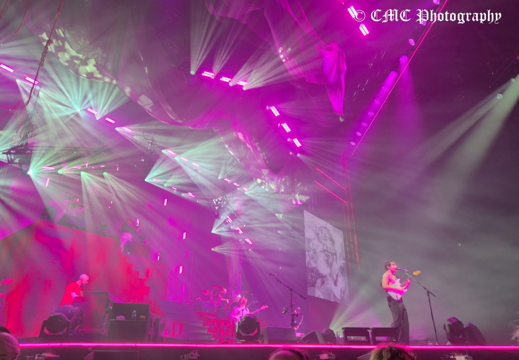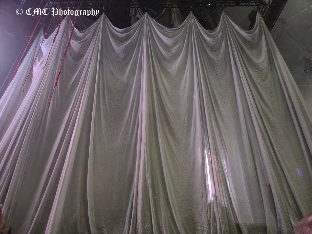 At 8:50pm the houselights dimmer and amid swarming red lights, set opener A Little Love began behind the “midgie net” much to the delight of the crowd. A few seconds later, the front curtain dropped to reveal a second tented layer that was finally raised a couple of minutes later to finally reveal Biffy Clyro. Dramatic start to their twenty-three song set.