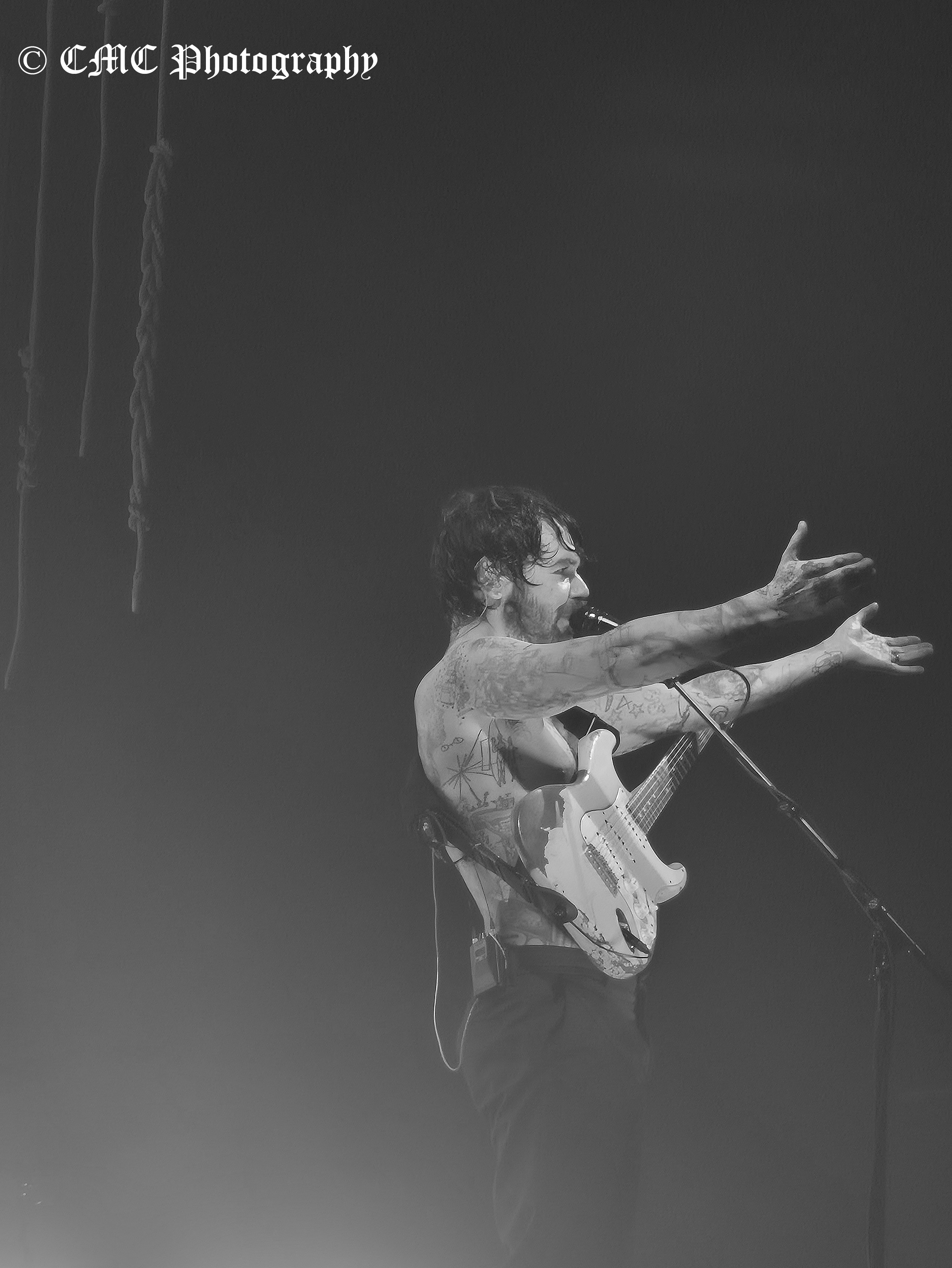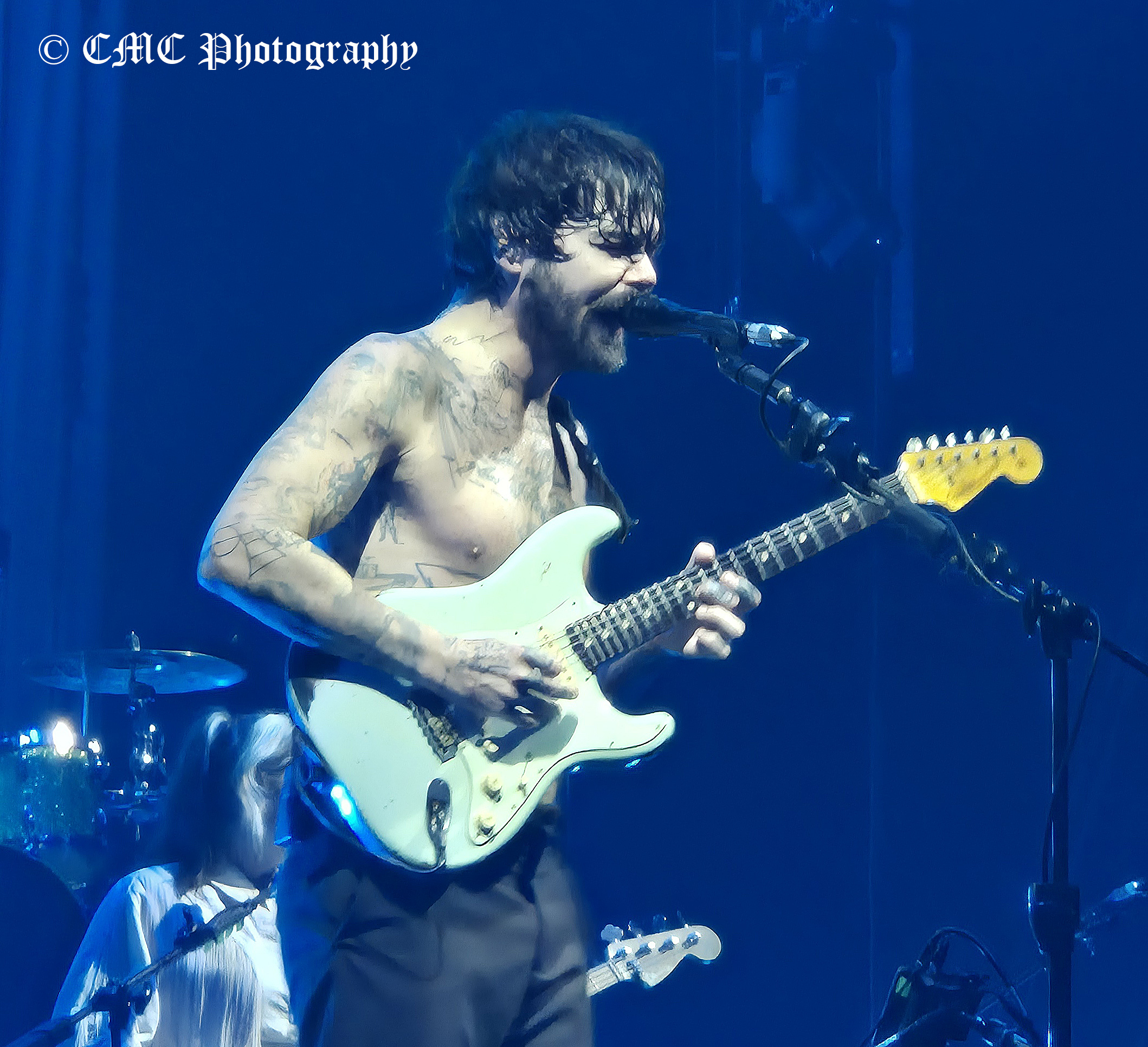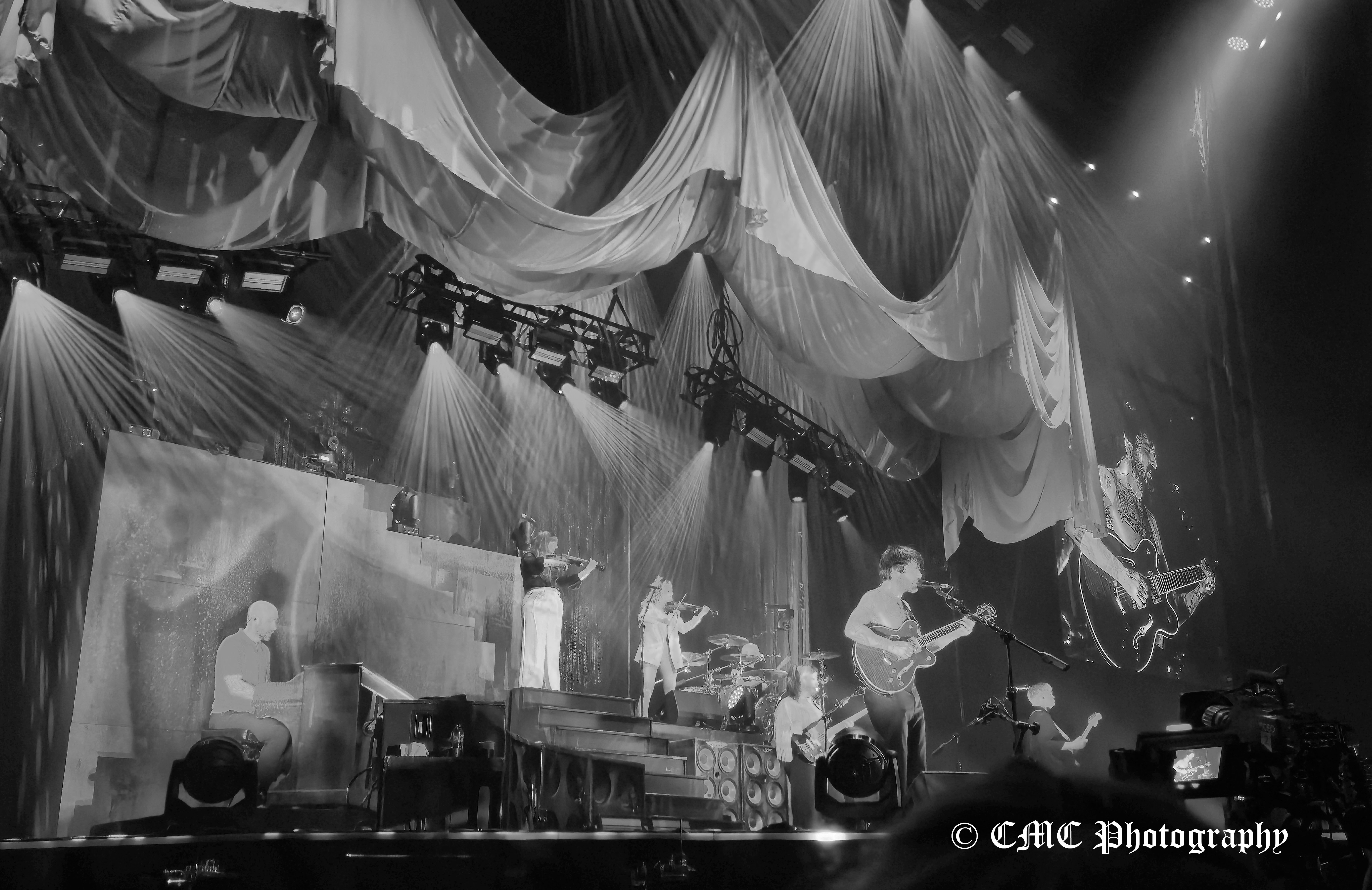 At 8:50pm the houselights dimmer and amid swarming red lights, set opener A Little Love began behind the “midgie net” much to the delight of the crowd. A few seconds later, the front curtain dropped to reveal a second tented layer that was finally raised a couple of minutes later to finally reveal Biffy Clyro. Dramatic start to their twenty-three song set.