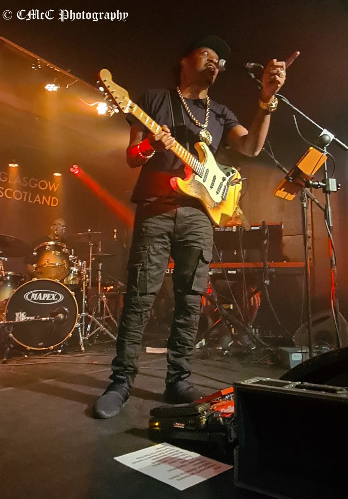 Towards the end of the set, a female member of the audience (a little the worse for drink most likely) shouted out to him to “Play some f**kin’ Blues!” He took her on quite nicely (firmly and politely) suggesting that if she wanted to hear Blues rather than his personal mix of Blues/Rock/Funk that she listen to some alternative artists. (I’m naming no names here). He started to play the next song on the setlist, Too Close To The Fire, then stopped playing. He stopped his band too then reflected back to his earlier comment about hoping to inspire at least one person in the room adding if the lady wanted to hear some “f**kin’ Blues” then he’d play her some “f**kin’ Blues – cue impromptu Blues solo! Incredible playing and the best way ever to shut up a heckler. Well played, sir! Loved it!