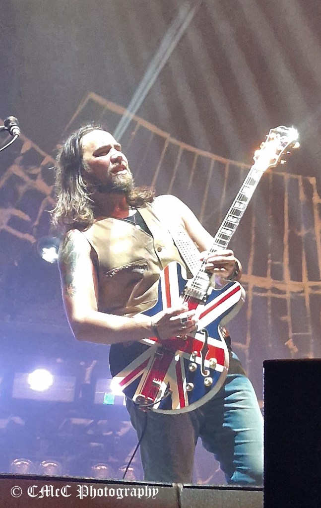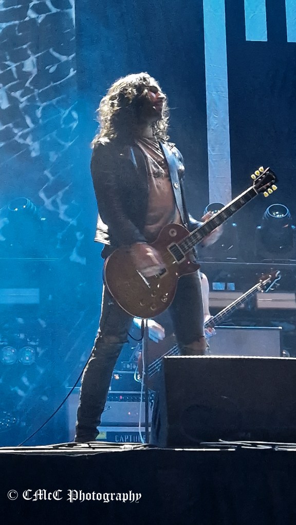 At 6:55 pm the lights dinned and opening act Mammoth WVH took to the stage. I was standing further to the left than I had been in Glasgow earlier in the week so had a great view of guitarist Frank Sidoris and bassist Ronnie Ficaro and of course the super talented Wolf Van Halen. Half an hour just isn’t enough, although these guys crammed seven songs into it. Wolf’s dad is never far from his thoughts. Introducing Think It Over, Wolf commented that it had been his dad’s favourite. Loved it.